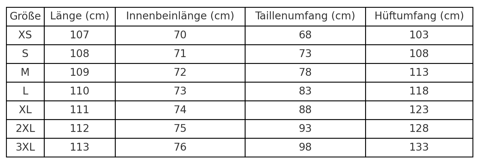 Größe Taille (cm) Hüfte (cm) Beininnenlänge (cm)