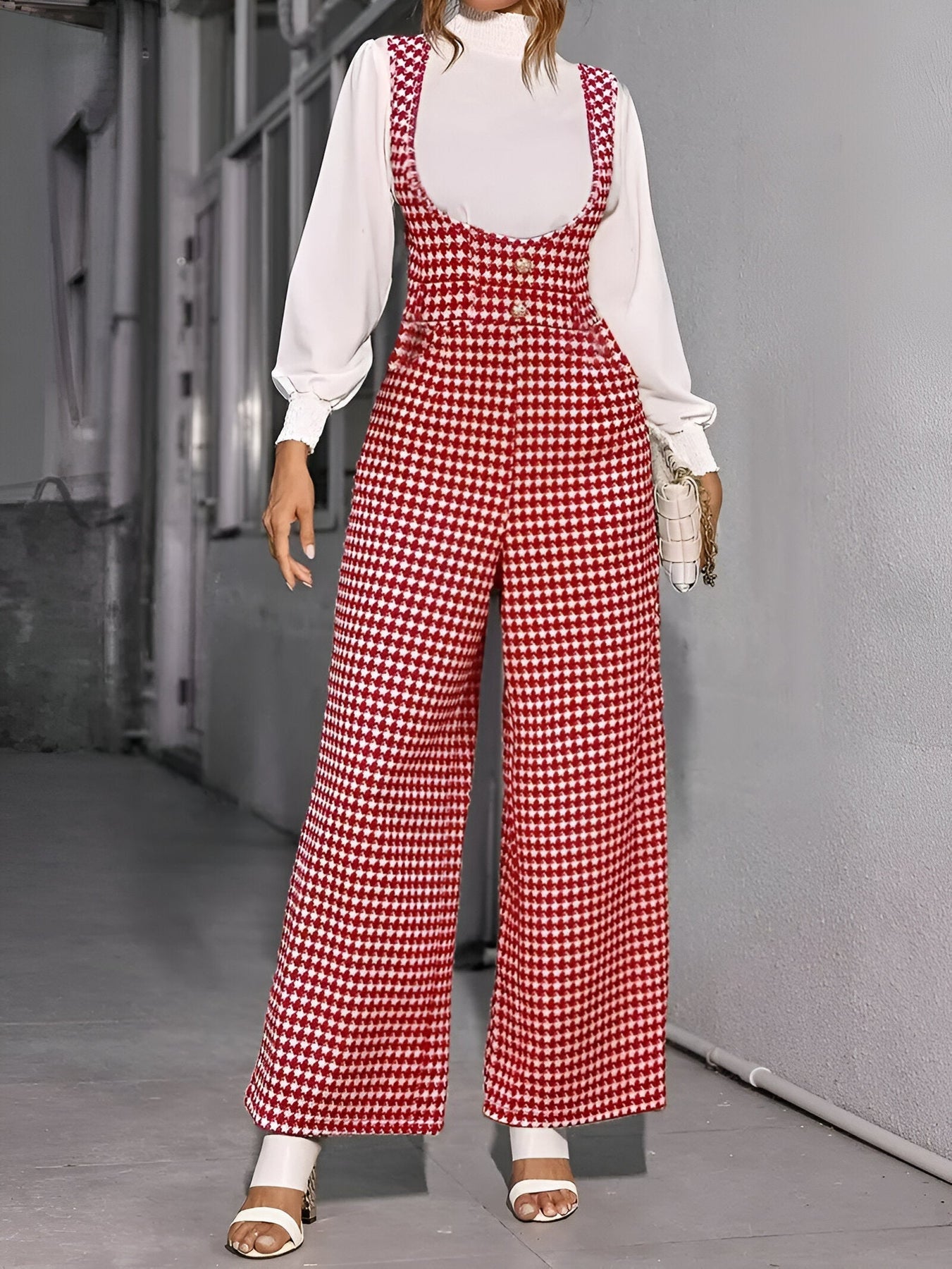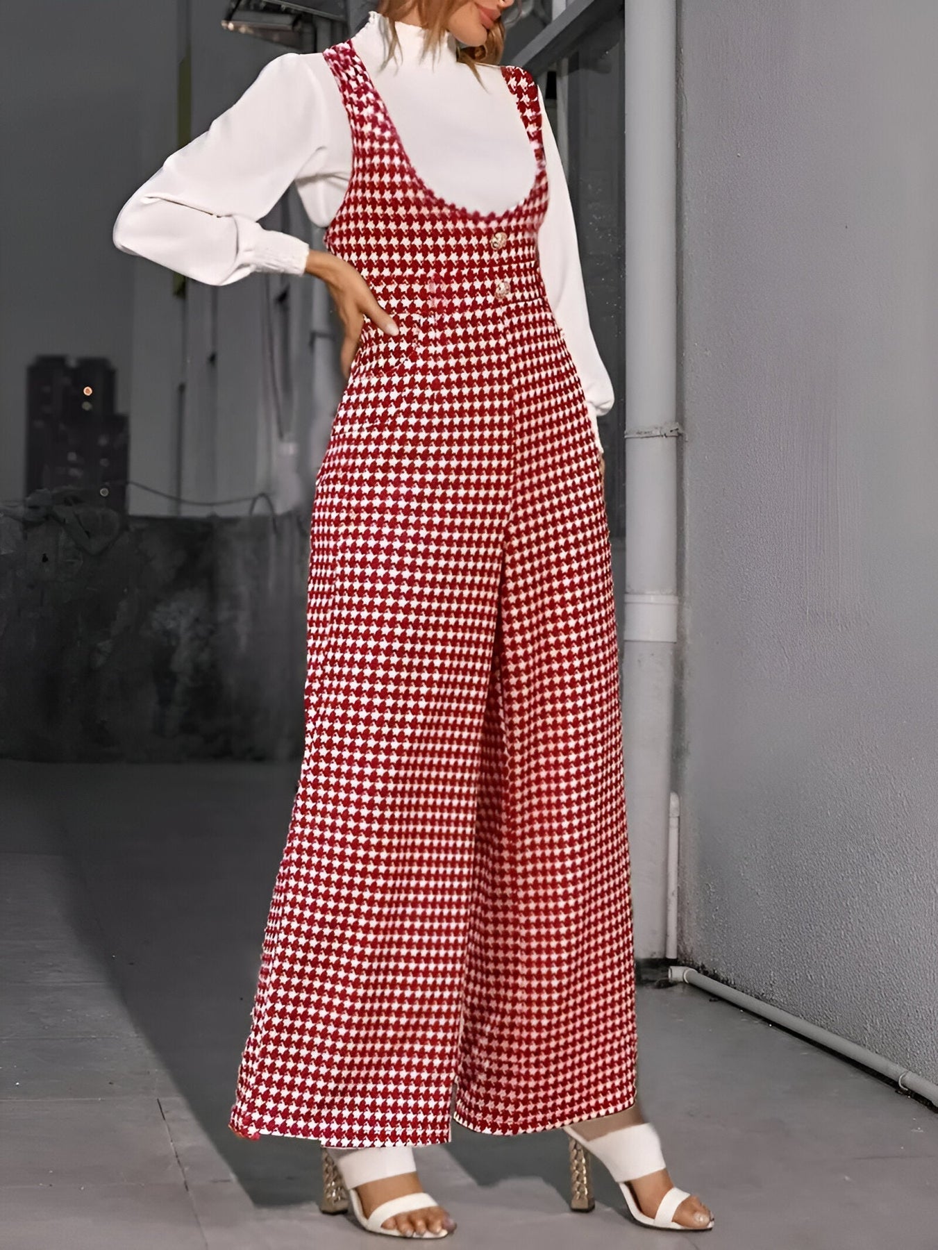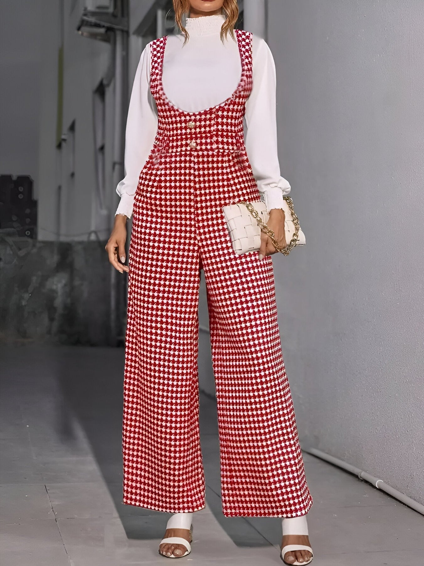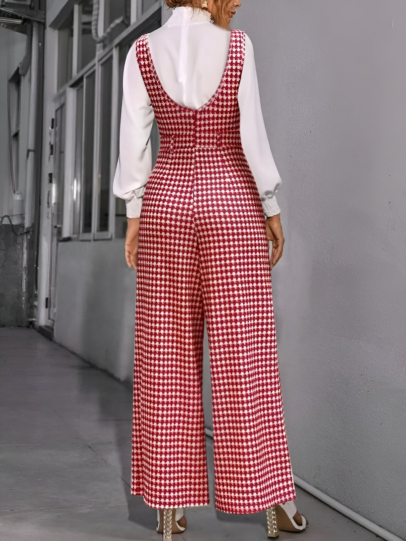Stell dir vor, du trittst in einem Jumpsuit auf, der Eleganz und Komfort vereint und dir den ganzen Tag über Selbstvertrauen und Stil verleiht. Mit seinem zeitlosen Hahnentritt-Muster, weiten Beinen und praktischen Taschen wird dieser Jumpsuit schnell zu deinem Favoriten für jedes lässige Outing. Ob an einem sonnigen Frühlingstag, einem entspannten Sommerabend oder einem frischen Herbstnachmittag – dieses vielseitige Stück sorgt dafür, dass du immer fabelhaft aussiehst und dich gleichzeitig wohlfühlst.