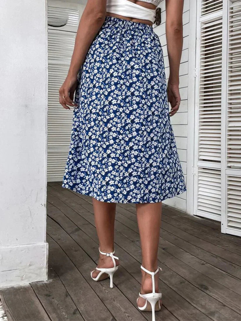 Erlebe zeitlose Weiblichkeit mit diesem wunderschön fließenden Midirock. Mit zarten Blumenmustern und einer romantischen Rüsche verziert, ist er das perfekte Stück für sonnige Tage, entspannte Spaziergänge oder besondere Anlässe, an denen du stilvoll strahlen möchtest.