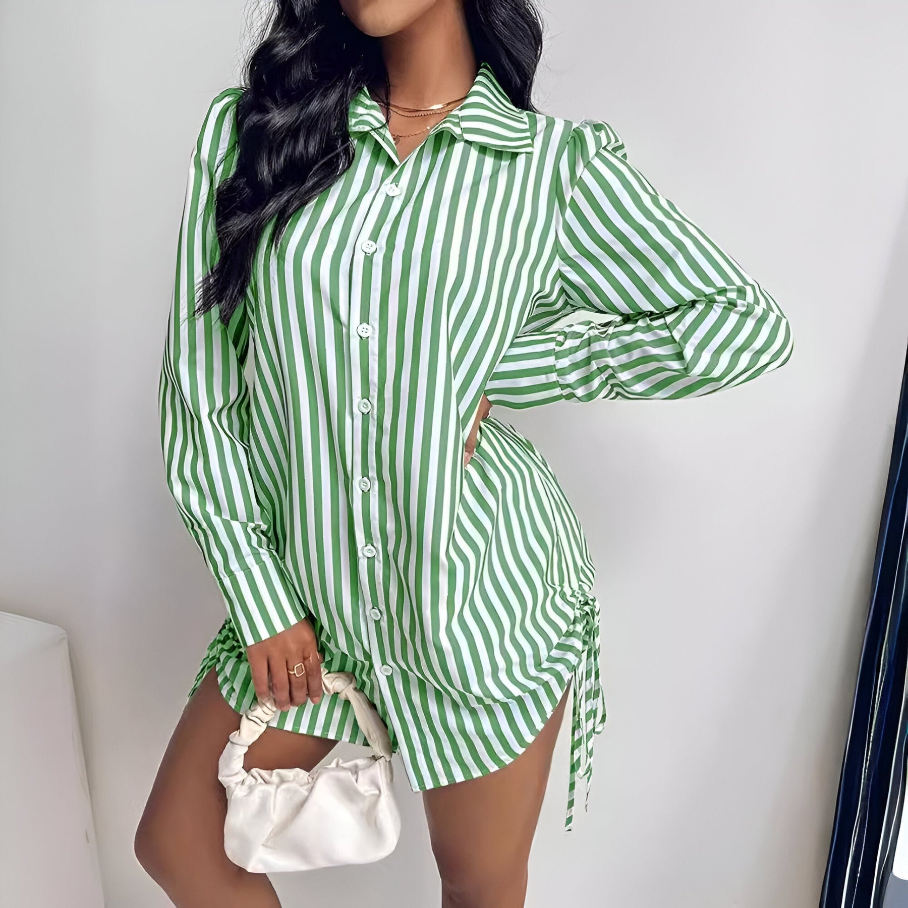 Stell dir vor, du gehst stilvoll durch die Saison, fühlst dich mühelos schick und bereit für alles. Ob du an einem sonnigen Nachmittag im Park spazieren gehst oder dich mit Freunden zum Brunch triffst, dieses Kleid hebt deinen Look mit seinem zeitlosen Design und der schmeichelhaften Passform. Die weichen Streifen und die zarte Spitzenverzierung verleihen dem Kleid genau die richtige Portion Raffinesse und machen es zur perfekten Ergänzung deiner Garderobe.