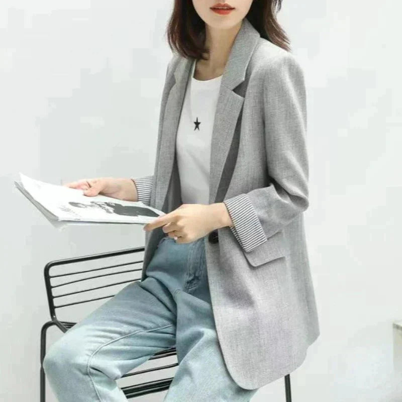 Dieser Damenblazer ist aus leichtem Stoff gefertigt, ideal für Übergangszeiten. Er verfügt über einen Reverskragen und lange Ärmel, mit einem einzelnen Knopfverschluss. Mit einem gestreiften Detail an den Manschetten. Dieser Blazer kann offen oder mit geschlossenem Knopf getragen werden.