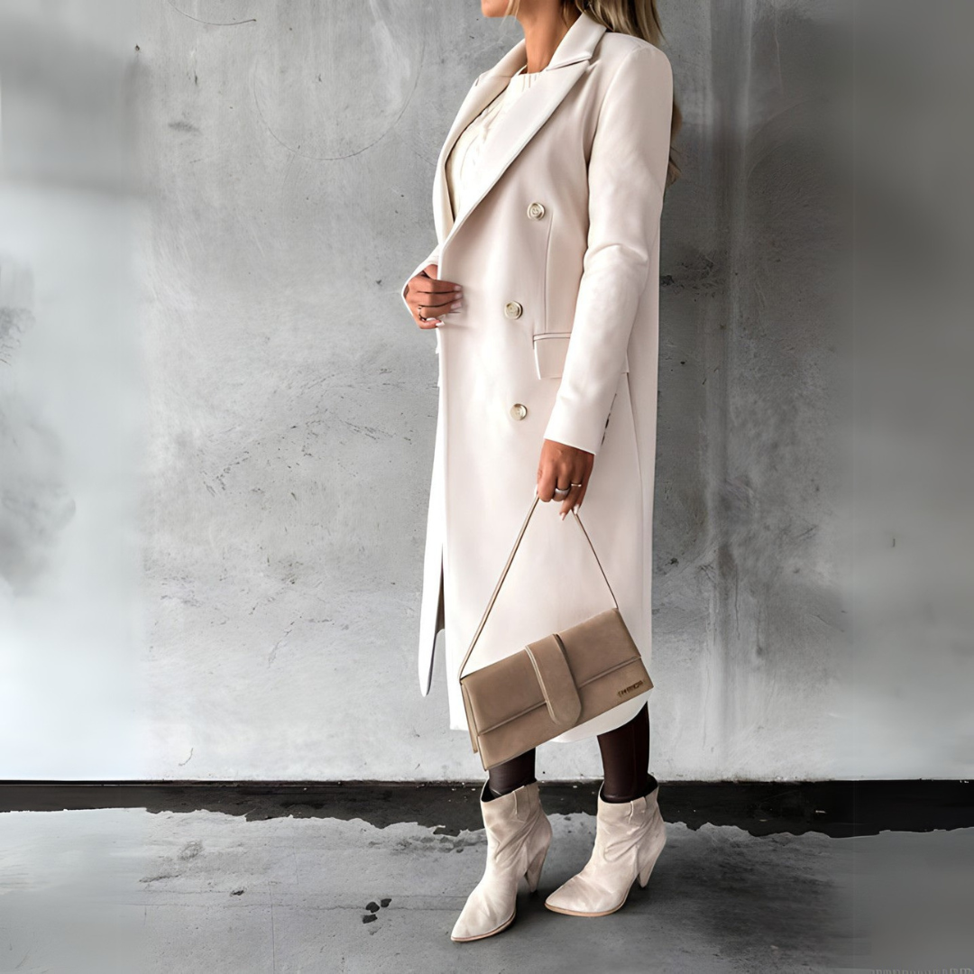 Dieser Mantel besticht durch sein tailliertes Design mit doppelreihiger Vorderseite und Knopfdetails. Er verfügt über einen strukturierten Kragen und Revers sowie zwei Pattentaschen für zusätzliche Funktionalität. Die knielange Passform unterstreicht das elegante Erscheinungsbild. Die klare Silhouette verleiht einen edlen Touch, ideal für unterschiedliche Vorlieben.