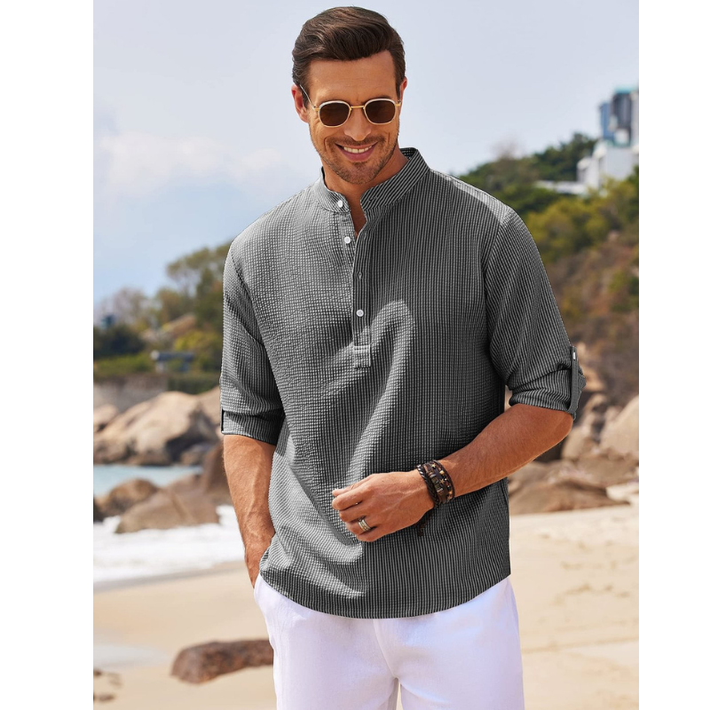 Dieses Hemd verfügt über einen Stehkragen und ein Design mit halber Knopfleiste. Die Dreiviertelärmel sind mit Laschen ausgestattet, um sie hochzukrempeln. Der gerade Saum verleiht der entspannten Silhouette einen sauberen Abschluss.