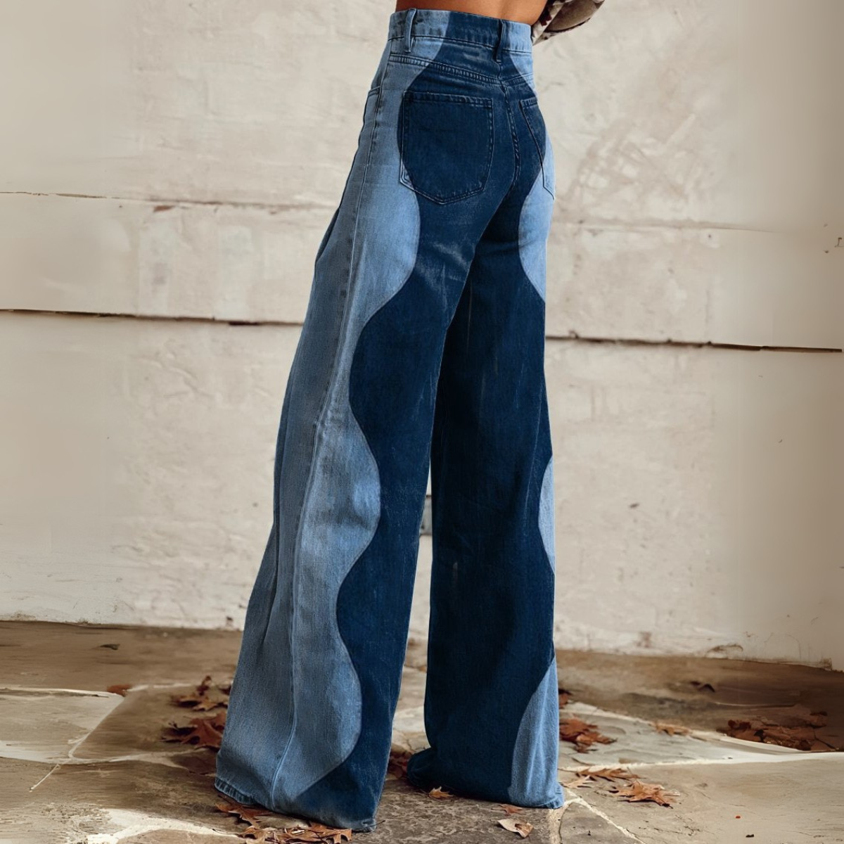 Diese hochgeschnittene Hose besticht durch ein auffälliges wellenförmiges Design mit markantem Kontrast. Der weite Schnitt sorgt für eine fließende Silhouette, während der strukturierte Bund mit Knopf- und Reißverschluss sicheren Halt bietet. Sichtbare Nähte unterstreichen das Design und setzen modische Akzente.