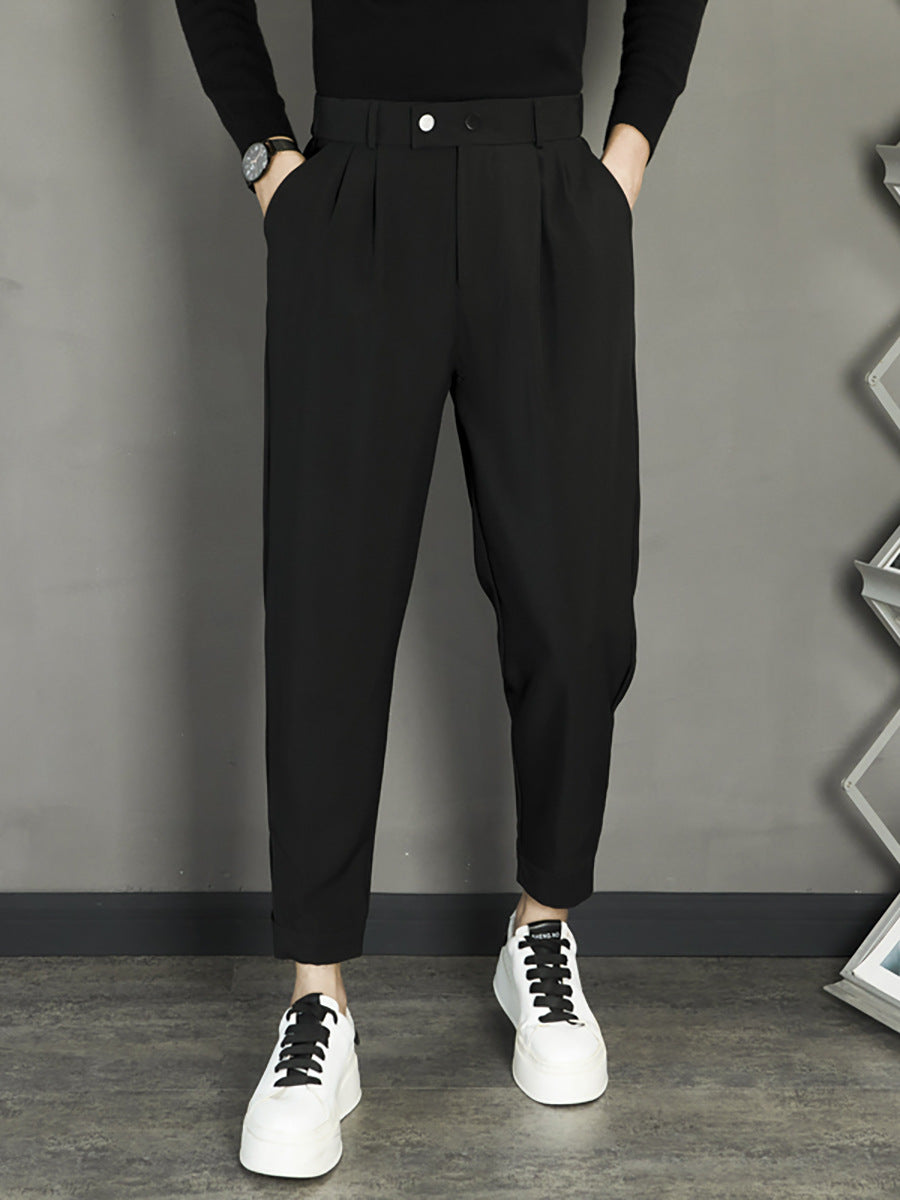 - Feine Details: Vorderfalten und dekorative Knöpfe an der Taille.