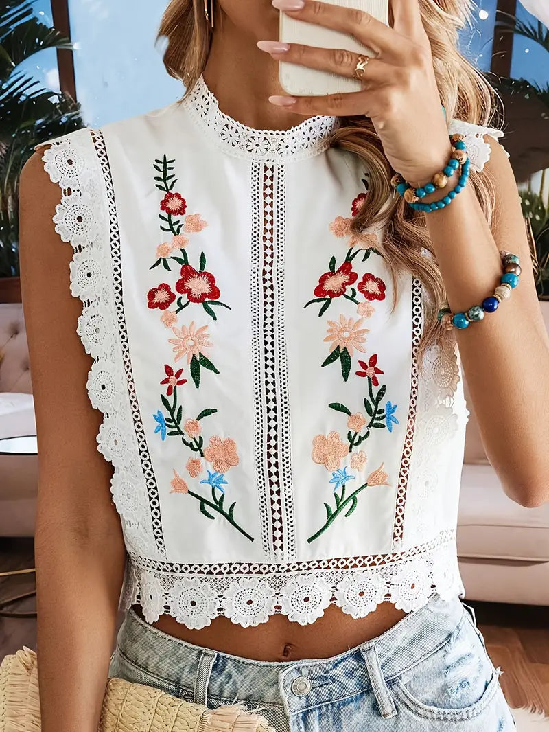 1. Zarte florale Stickerei – Das filigrane florale Design verleiht dem Top einen eleganten Touch und macht es sowohl für lässige als auch für etwas schickere Looks ideal.
