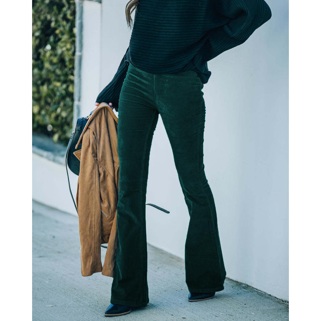 Diese Hose verfügt über eine ausgestellte Silhouette mit einer hohen Taille, die eine klare, schlanke Optik bietet. Das Design umfasst dezente Nähte entlang der Beine, die zur Gesamtstruktur der Hose beitragen.