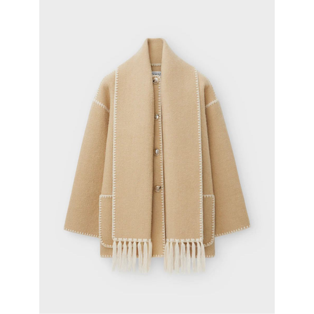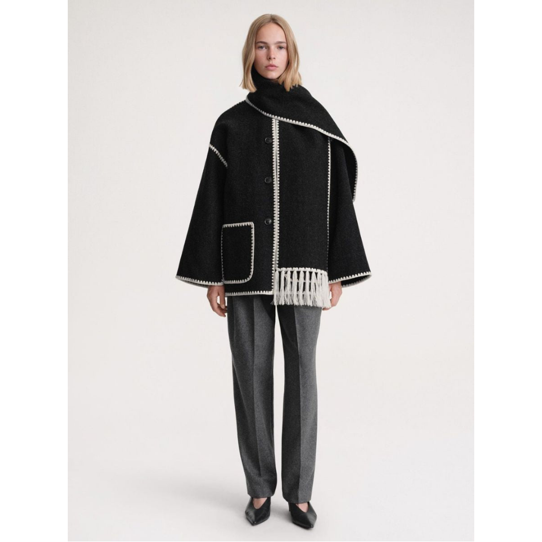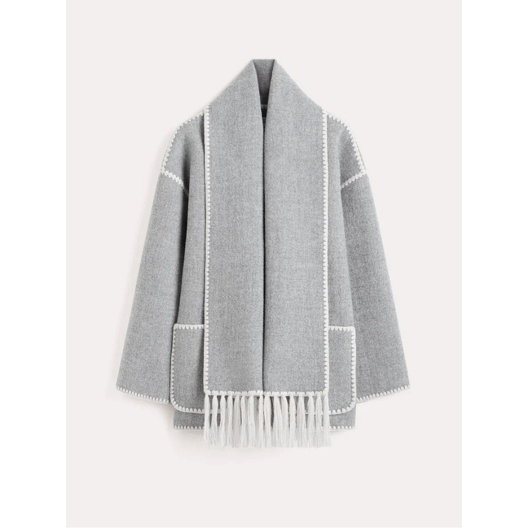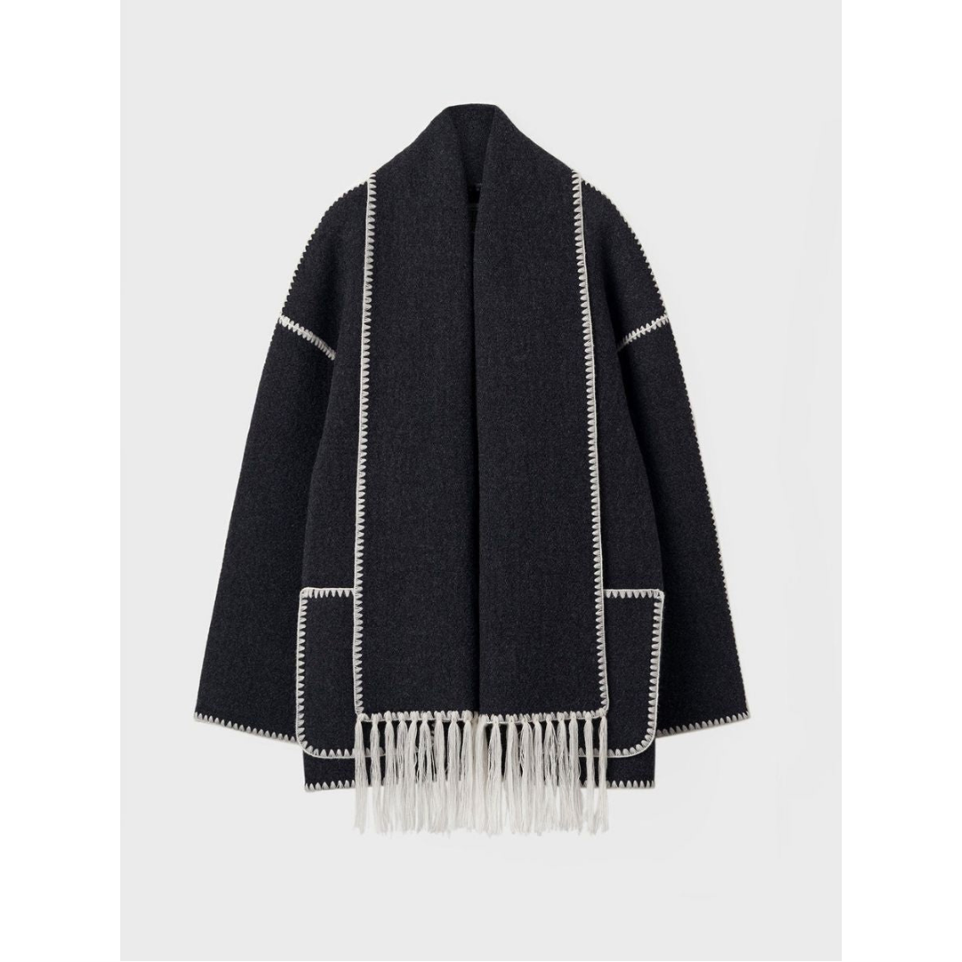 Dieser Mantel zeichnet sich durch ein klassisches Design mit einer Knopfleiste und dekorativen Fransen entlang der Kanten aus. Er verfügt über zwei Fronttaschen, jede mit einer einfachen Stickerei. Die Kontrastnähte entlang der Nähte betonen die Form des Mantels.