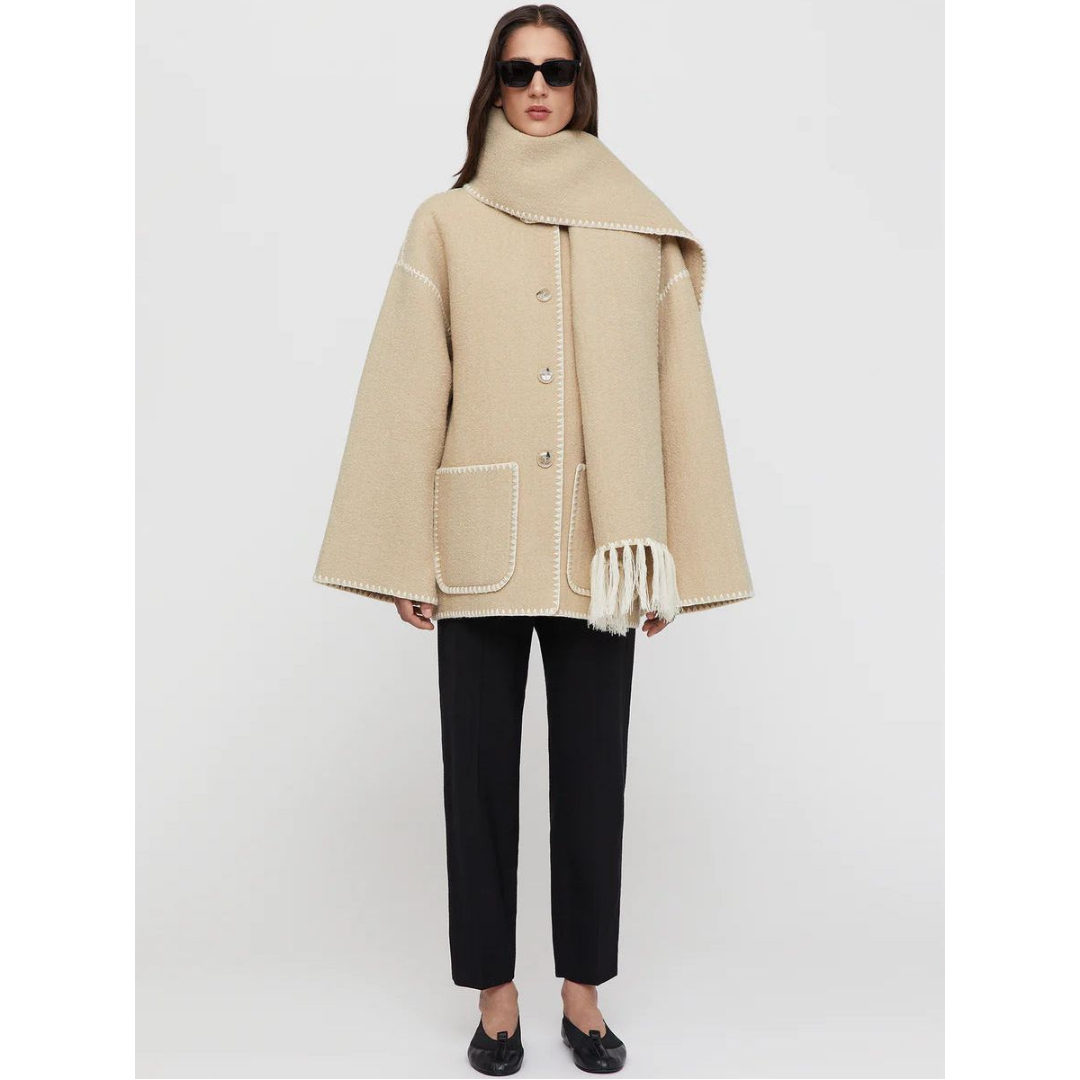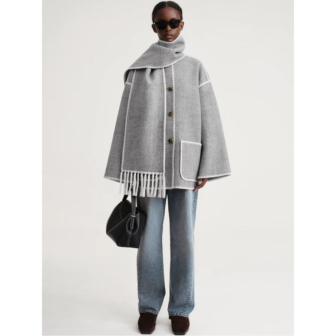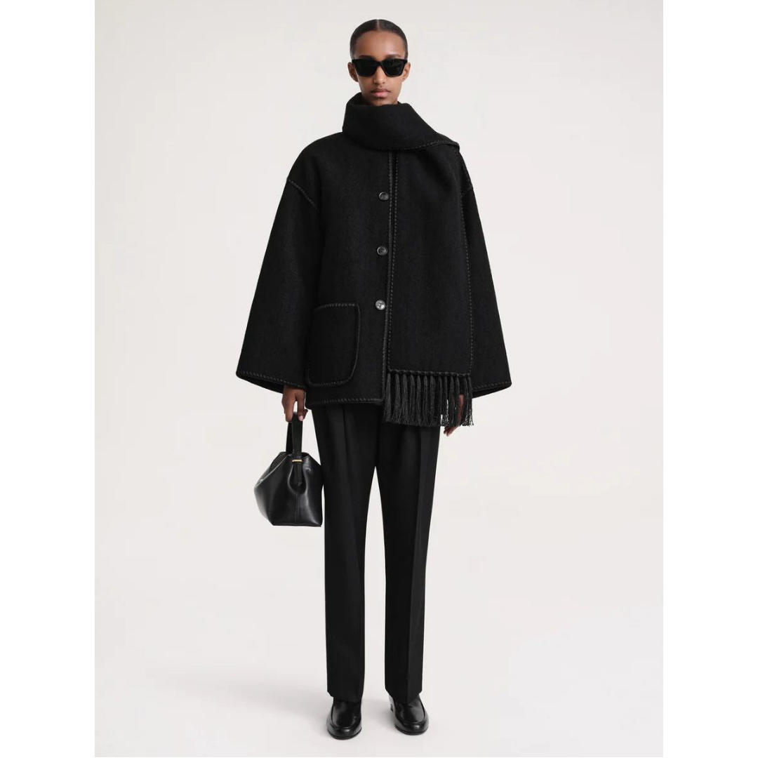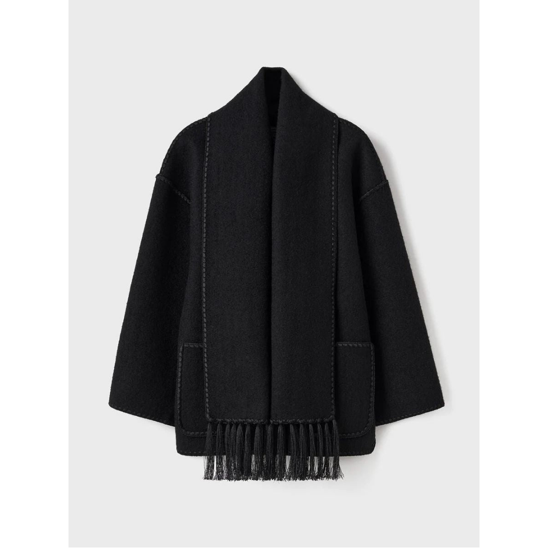 Dieser Mantel zeichnet sich durch ein klassisches Design mit einer Knopfleiste und dekorativen Fransen entlang der Kanten aus. Er verfügt über zwei Fronttaschen, jede mit einer einfachen Stickerei. Die Kontrastnähte entlang der Nähte betonen die Form des Mantels.