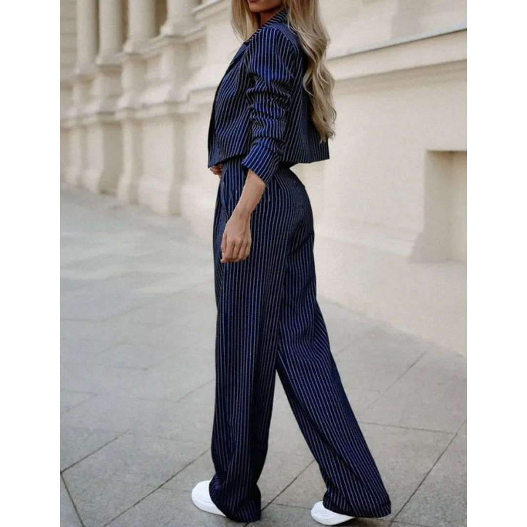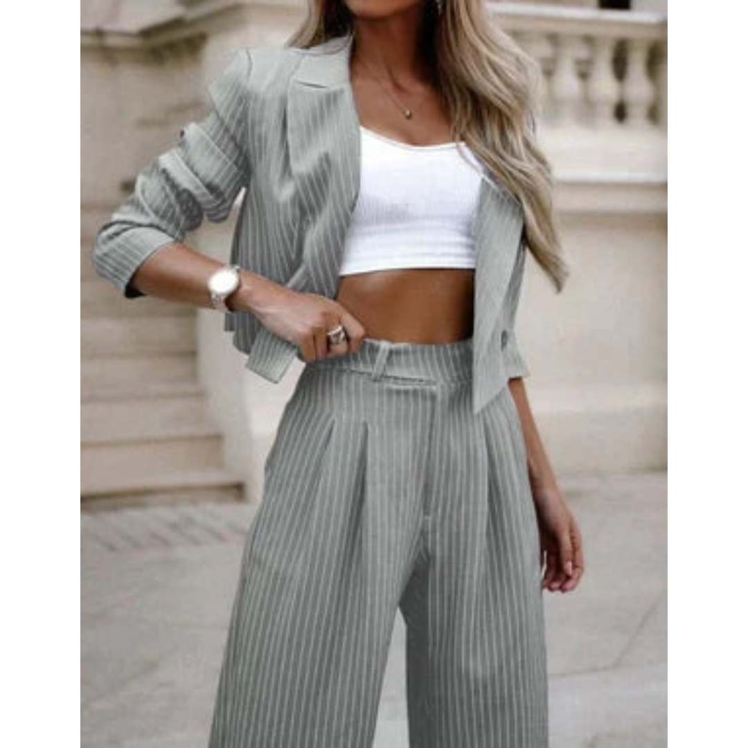 Dieses Anzugset besteht aus einem Blazer mit Ein-Knopf-Verschluss und einer passenden Hose mit hohem Bund und lockerem Schnitt. Beide Teile zeigen ein Streifenmuster für einen einheitlichen und strukturierten Look.