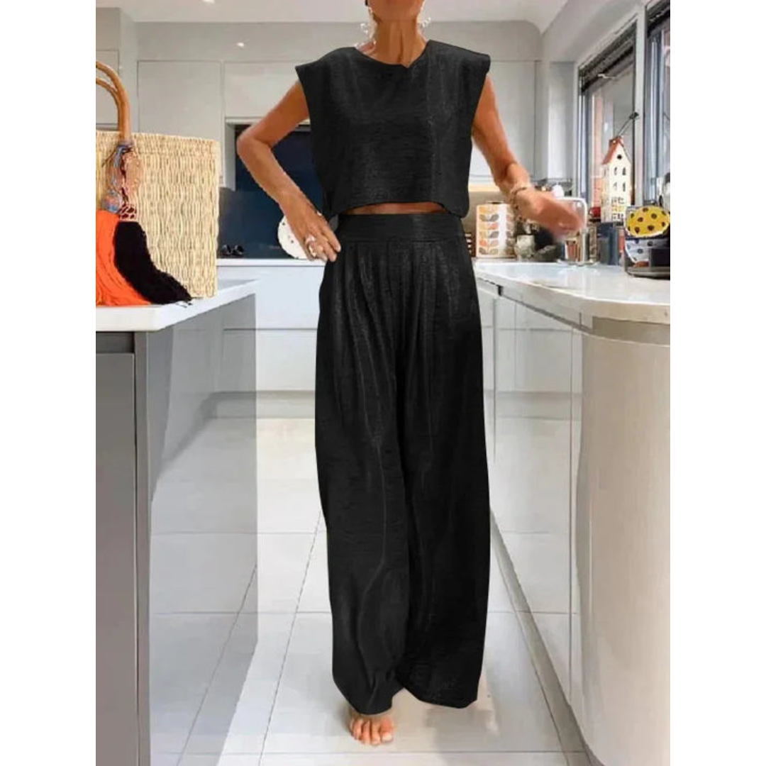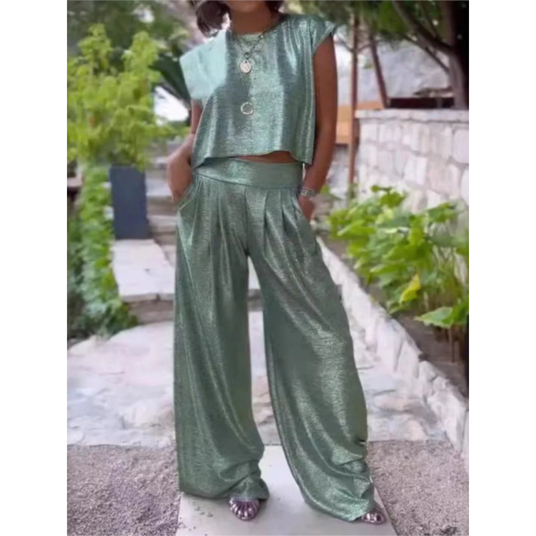 Dieses Zweiteiler-Set besteht aus einem ärmellosen Oberteil und weit geschnittenen Hosen mit einer reflektierenden Oberfläche. Das Oberteil hat einen kastigen, verkürzten Schnitt, während die Hose hoch tailliert und fließend geschnitten ist. Ein vielseitiges Set für unterschiedliche Vorlieben.