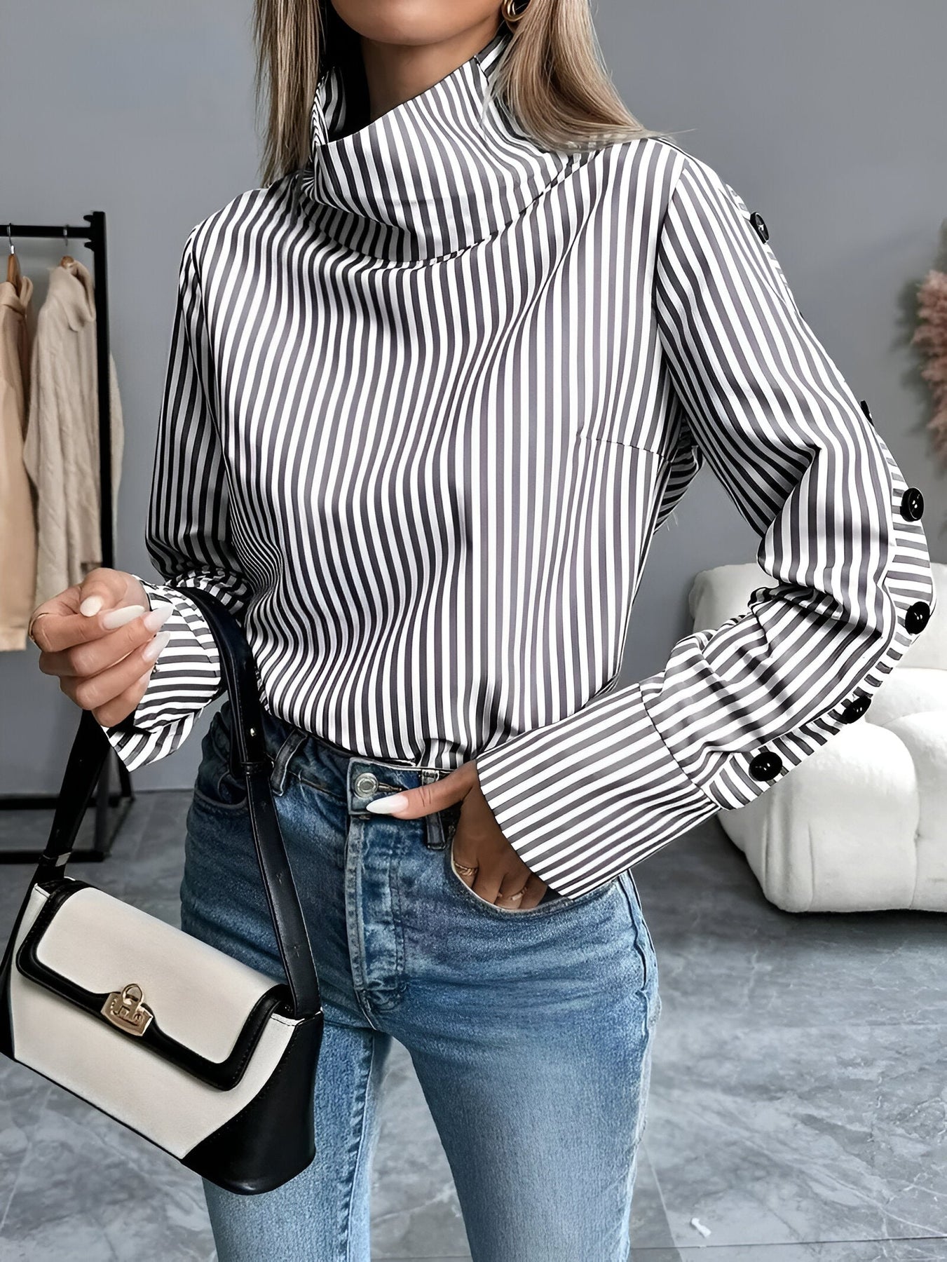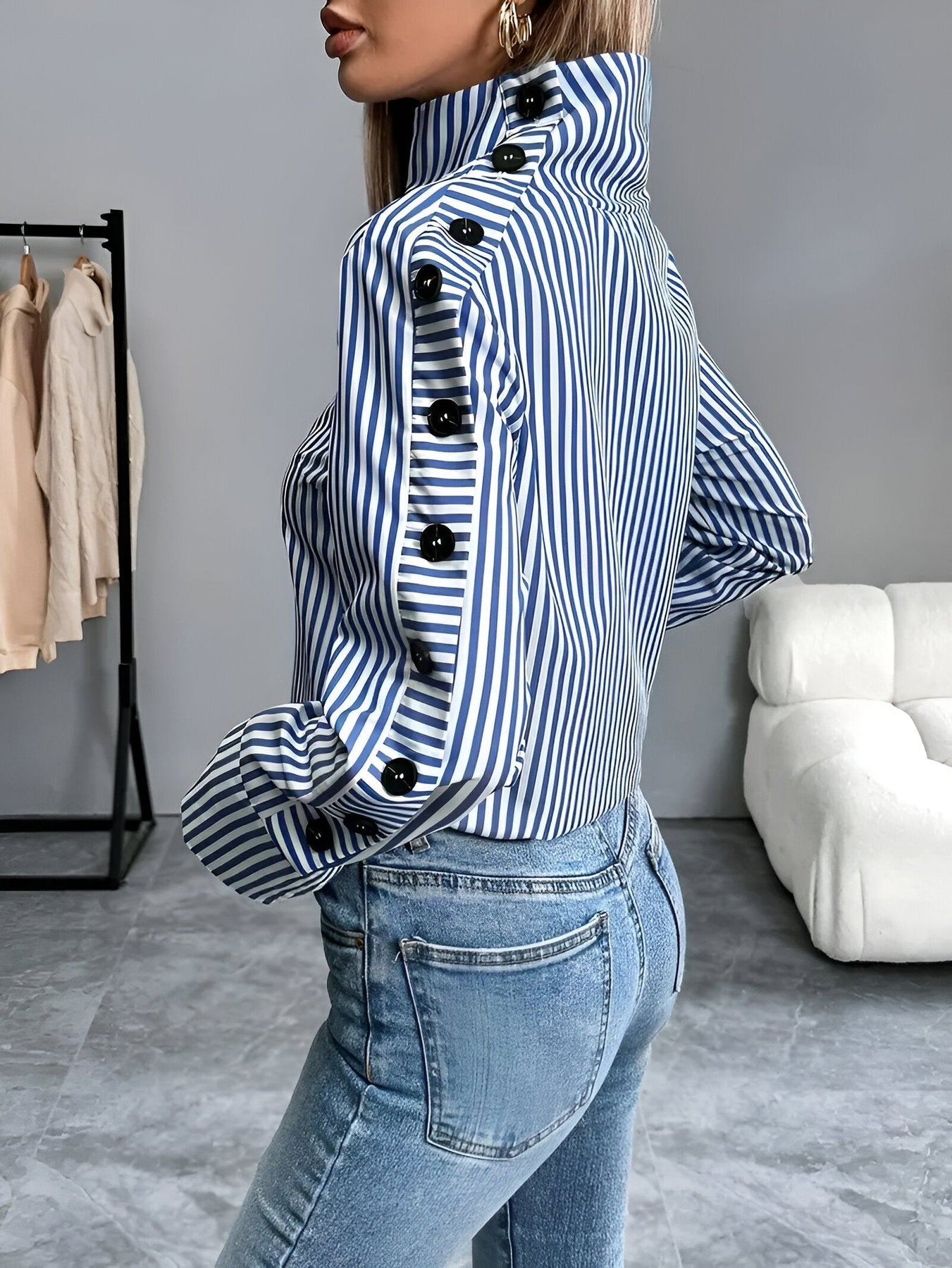 Das klassische Streifenmuster und der weite Kragen verleihen diesem Shirt einen raffinierten, aber entspannten Look. Die einfachen Knopfdetails setzen einen eleganten Akzent, sodass es sich mühelos mit Jeans, Röcken oder Hosen für jede Gelegenheit kombinieren lässt.