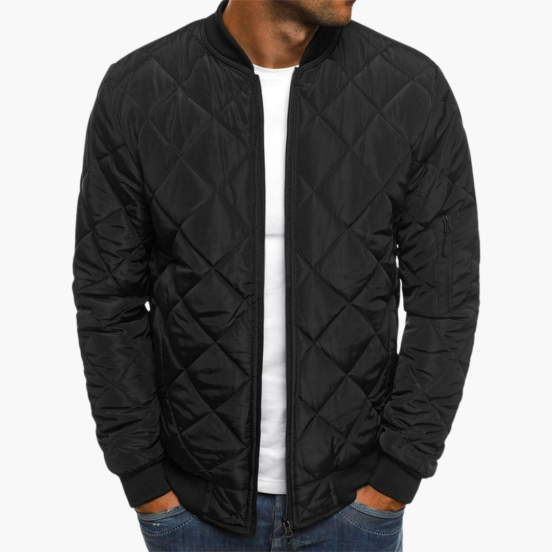 Diese Herren Bomberjacke hat einen kurzen Kragen und einen Reißverschluss an der Vorderseite. Sie verfügt über lange Ärmel mit gerippten Bündchen sowie einen gerippten Saum für eine klare Form. Zum Design gehören zwei Seitentaschen und eine Reißverschlusstasche am Ärmel. Die Oberfläche zeigt ein gestepptes Rautenmuster über den gesamten Körper und die Ärmel.