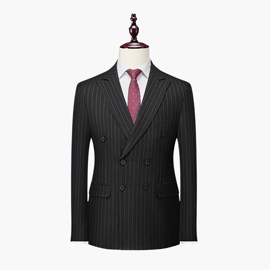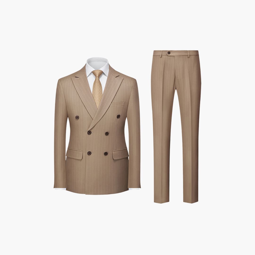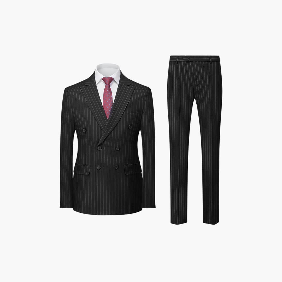 Dieser zweiteilige Herrenanzug besteht aus einem leichten Stoff, geeignet für den ganzjährigen Gebrauch. Die Kombination umfasst ein langärmliges, zweireihiges Sakko mit Nadelstreifen, Reverskragen und Klappentaschen sowie eine passende Hose. Der figurbetonte Schnitt eignet sich für verschiedene formelle Anlässe.