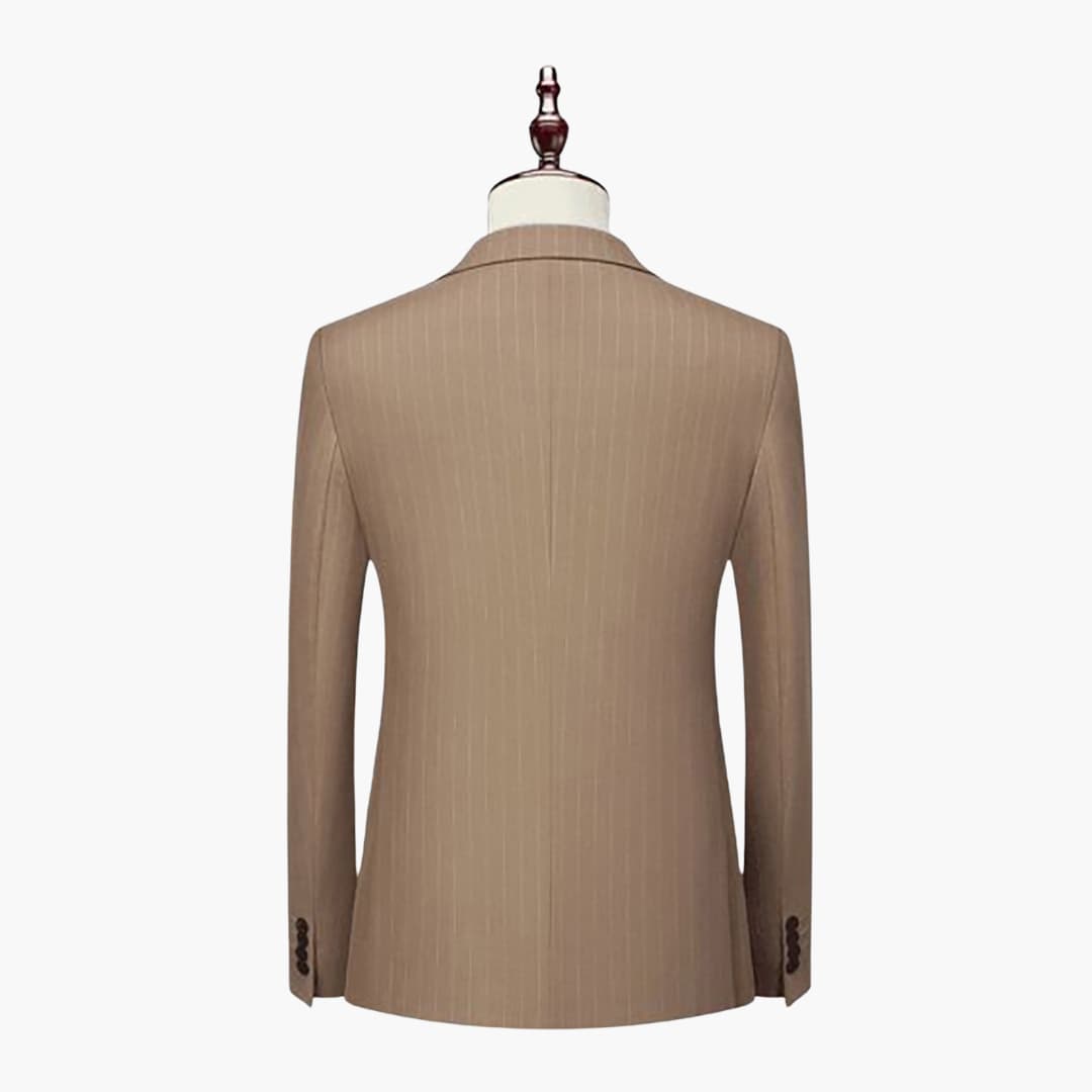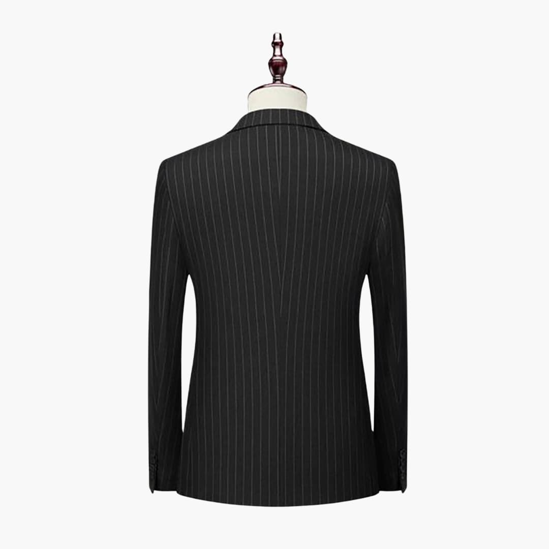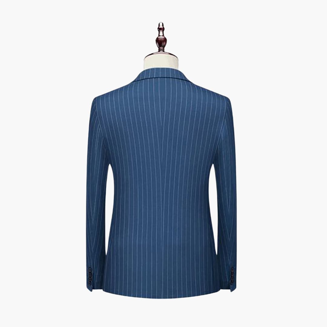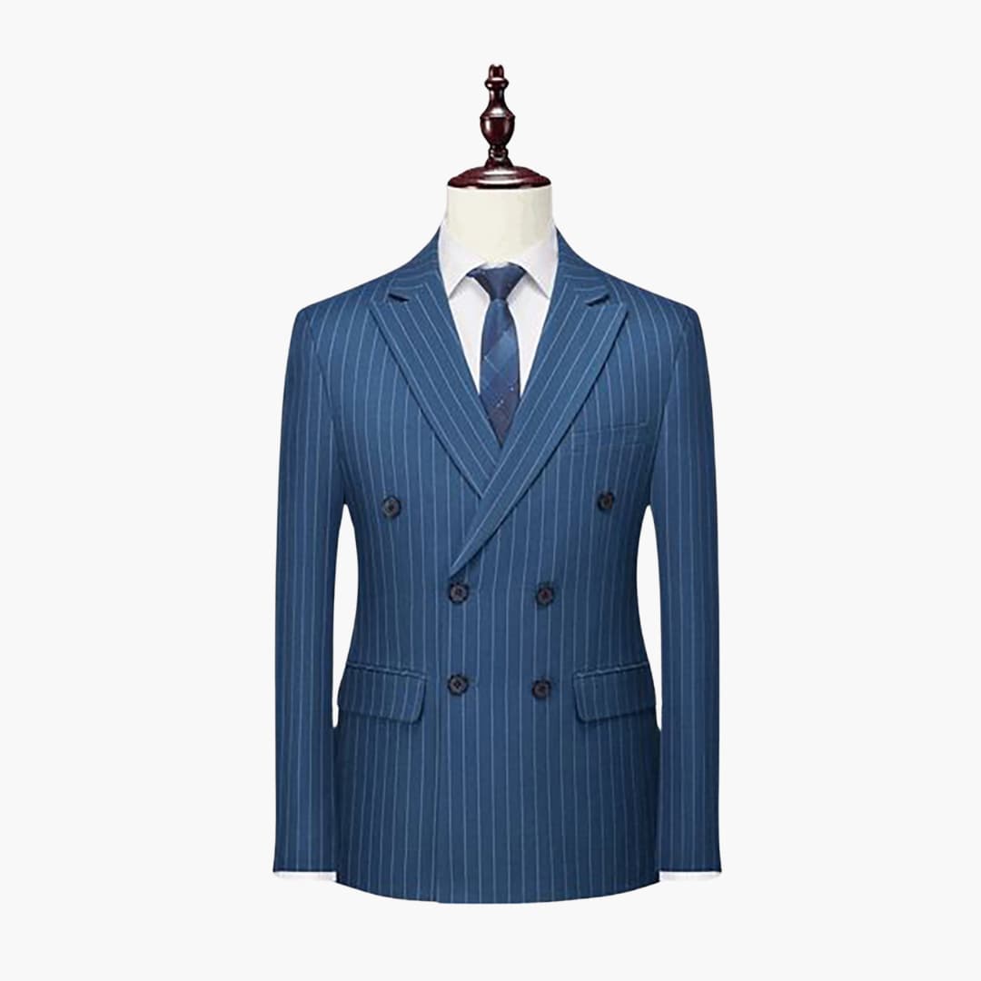 Dieser zweiteilige Herrenanzug besteht aus einem leichten Stoff, geeignet für den ganzjährigen Gebrauch. Die Kombination umfasst ein langärmliges, zweireihiges Sakko mit Nadelstreifen, Reverskragen und Klappentaschen sowie eine passende Hose. Der figurbetonte Schnitt eignet sich für verschiedene formelle Anlässe.