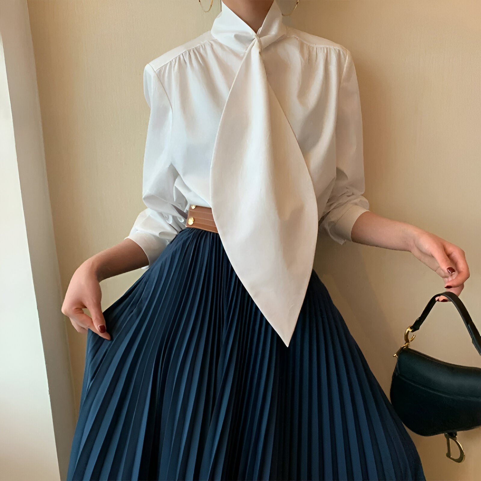 Stell dir vor, du trittst in eine Bluse, die Schlichtheit mit Raffinesse verbindet. Entworfen mit einem hohen Kragen und langen Ärmeln, bietet dieses elegante Top eine schmeichelhafte, lockere Passform, die sich für jeden Anlass eignet. Ob im Büro, bei einem zwanglosen Ausflug oder einem Abendessen – diese Bluse ist das vielseitige Stück, auf das deine Garderobe gewartet hat.
