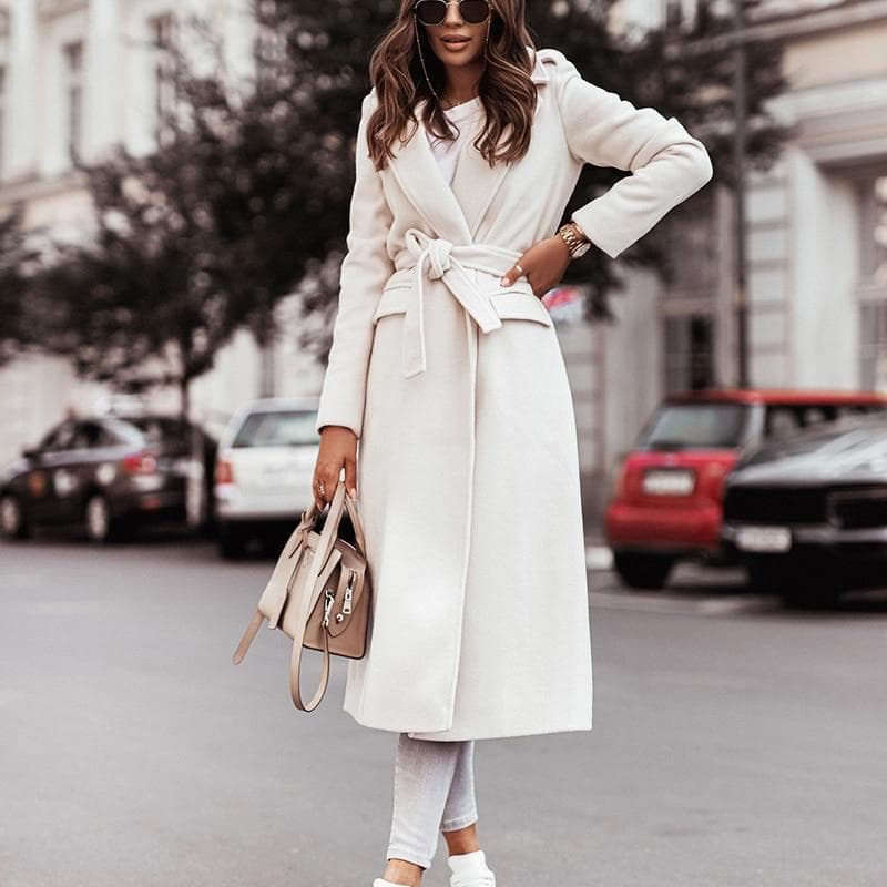 Dieser lange Mantel zeichnet sich durch ein Design mit Gürtel, einem strukturierten Kragen und einer taillierten Passform aus. Der Bindegürtel betont die Silhouette, während die Länge vollständige Abdeckung bietet. Das klare Design und die detaillierte Verarbeitung unterstreichen die elegante Ausführung.