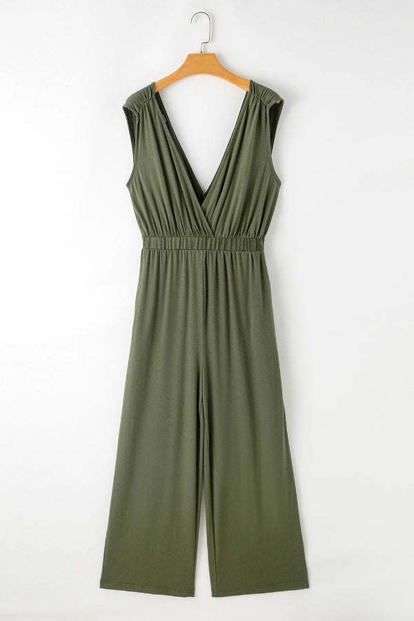 Laura® | Dschungelgrüner, plissierter Overall mit weitem Bein und tiefen V-Taschen