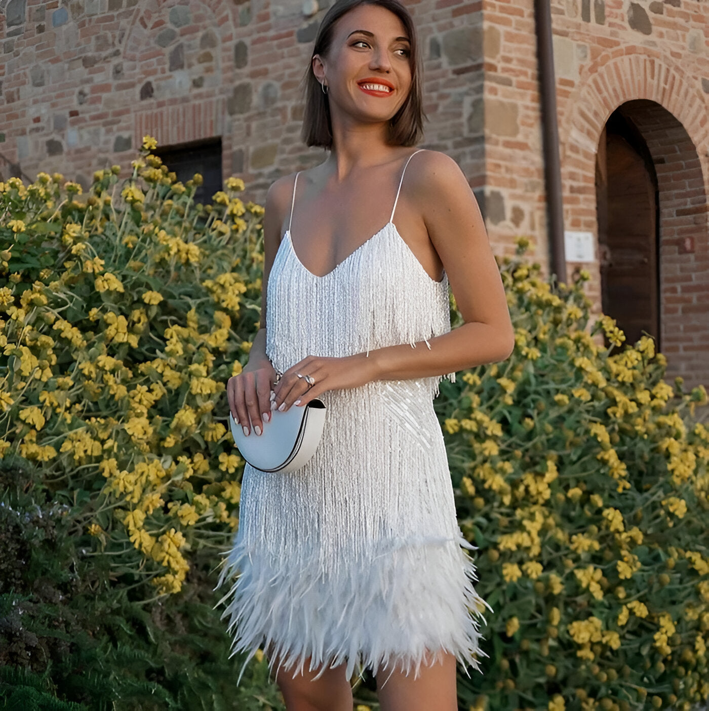 Dieses elegante Cocktailkleid ist dein Ticket, um alle Blicke auf dich zu ziehen und einen bleibenden Eindruck zu hinterlassen. Mit seinem glänzenden Pailletten-Design geht es nicht nur darum, atemberaubend auszusehen – es geht darum, sich die ganze Nacht über selbstbewusst und bequem zu fühlen.