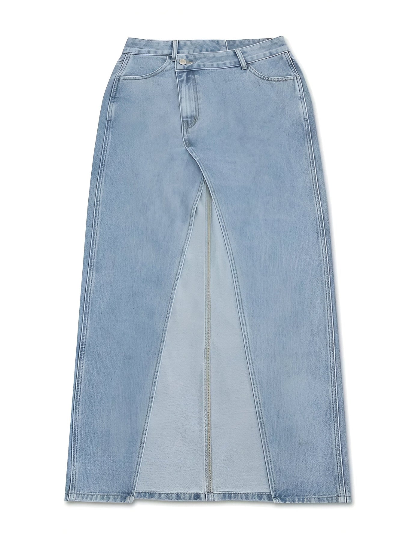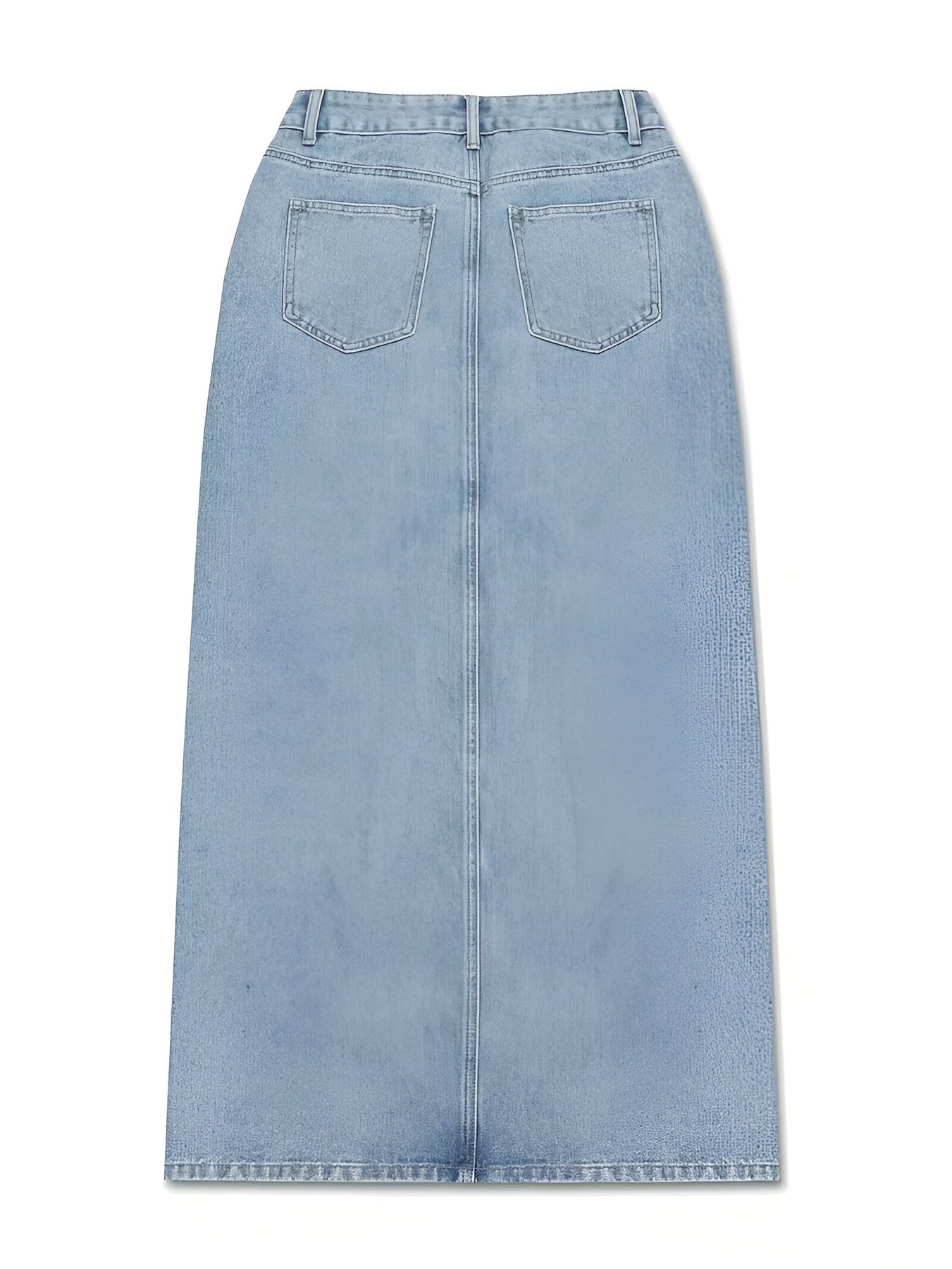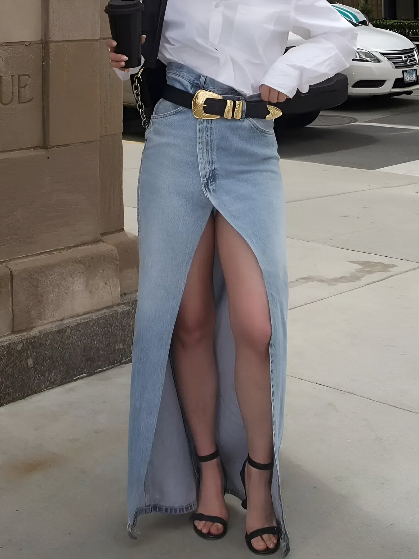 Stell dir vor, du schlüpfst in einen schicken, mittelgroßen Jeansrock, der Komfort und Stil mühelos vereint. Mit seinem vielseitigen Design ist dieser Rock perfekt für den Alltag, egal ob du zum Brunch gehst oder dich mit Freunden triffst. Der Schlitz und das Gürtel-Detail verleihen dem Rock das perfekte finishing touch und machen ihn zu einem Muss in deinem Kleiderschrank.