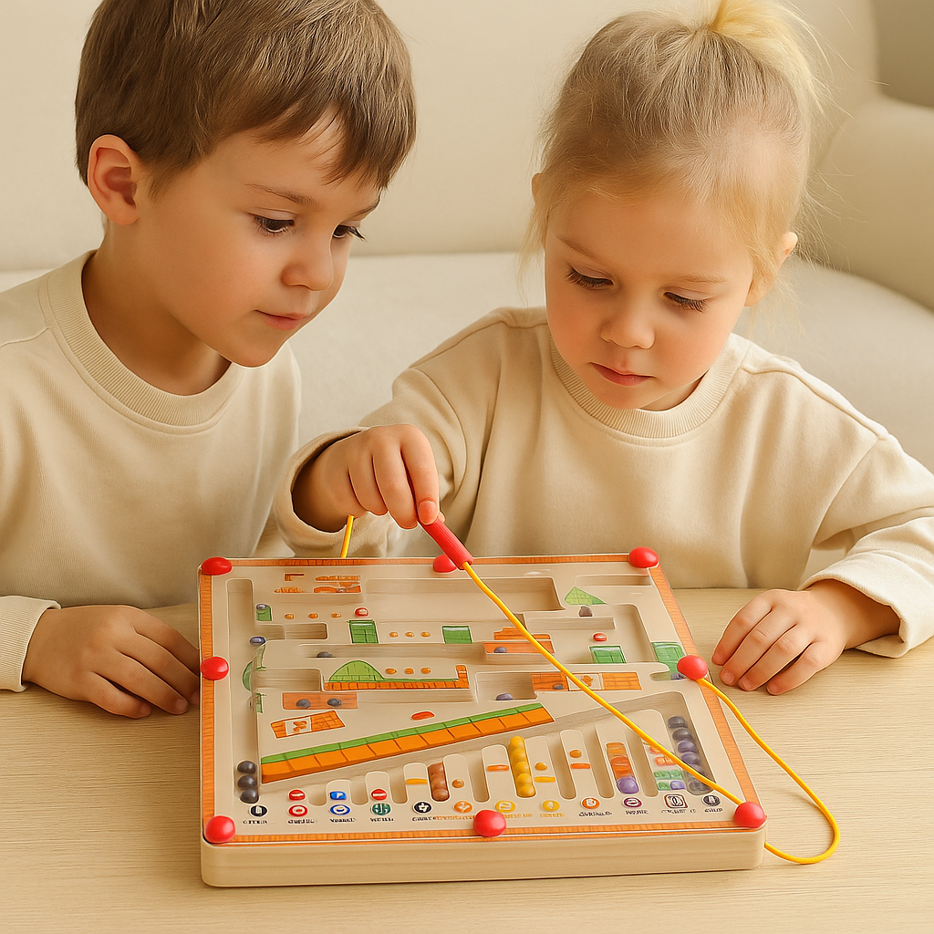 Dieses kompakte, rechteckige Brett bewegt Perlen mithilfe eines Magnetstifts durch ein Labyrinth und fördert so die Zahlenerkennung, die Hand-Auge-Koordination und das logische Denken. Ideal für zu Hause oder unterwegs, bietet es eine bildschirmfreie Aktivität, die die frühe Bildung spielerisch unterstützt.