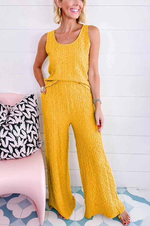 Matilde® | Gelbes Set aus Tanktop mit U-Ausschnitt in Knitteroptik und Hose mit weitem Bein