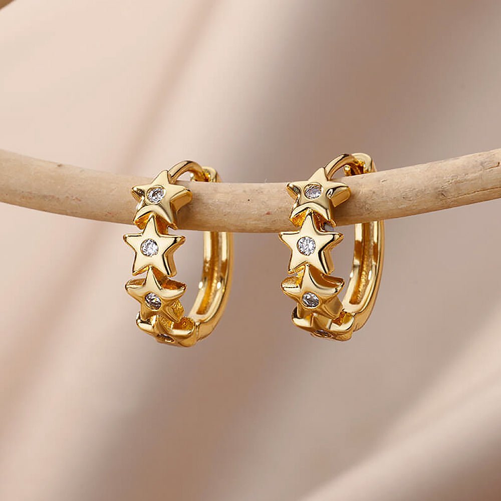 Hallo, Hübsche! ✨ Suchen Sie nach einer Möglichkeit, Ihren Look zu verbessern, ohne auf Komfort zu verzichten? Unsere Micara Starlit Charms sind das perfekte himmlische Accessoire für Sie! Diese atemberaubenden vergoldeten Creolen sind mit einer Konstellation funkelnder Sterne verziert und verleihen jedem Outfit einen Hauch von Magie. Mit diesem atemberaubenden Paar strahlen Sie heller als die Sterne. ✨