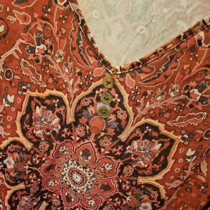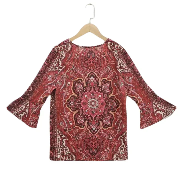 Stellen Sie sich vor, Sie spazieren durch einen bunten Herbstpark, während die Blätter unter Ihren Füßen rascheln. In diesem wunderschönen Top mit verspieltem Print und eleganten 3/4-Ärmeln sind Sie der Mittelpunkt der Aufmerksamkeit. Der V-Ausschnitt schmeichelt Ihrem Dekolleté und lässt Sie strahlen, während sich der weiche Stoff wie eine sanfte Umarmung anfühlt.
