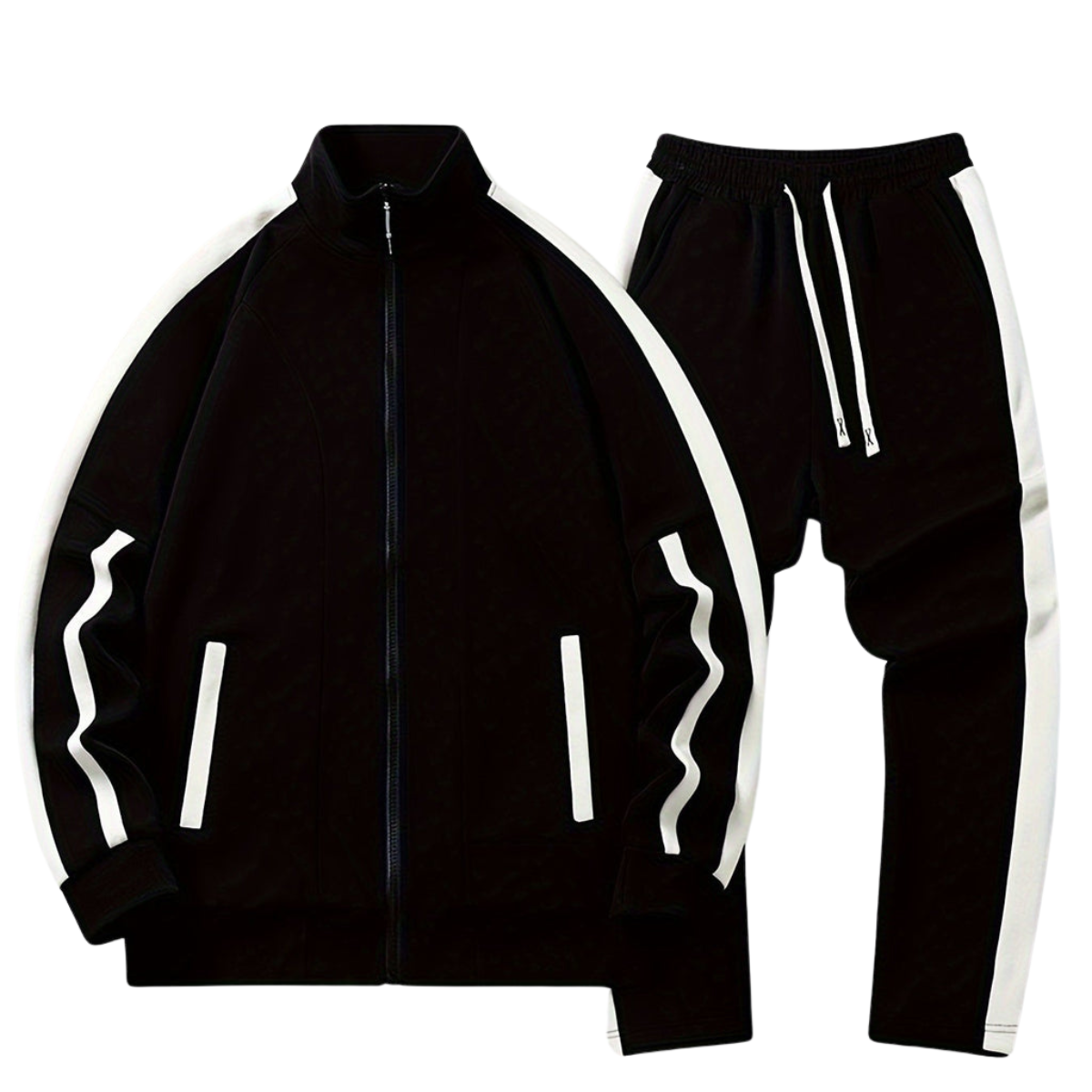 Dieser Trainingsanzug besteht aus einer Reißverschlussjacke und einer passenden Hose mit einem abgestimmten Streifendesign. Die Jacke hat einen hohen Kragen, zwei Seitentaschen und einen durchgehenden Reißverschluss. Die Hose ist mit einem elastischen Bund und einem Kordelzug ausgestattet. Die Streifendetails an den Ärmeln und Beinen setzen einen markanten Akzent.