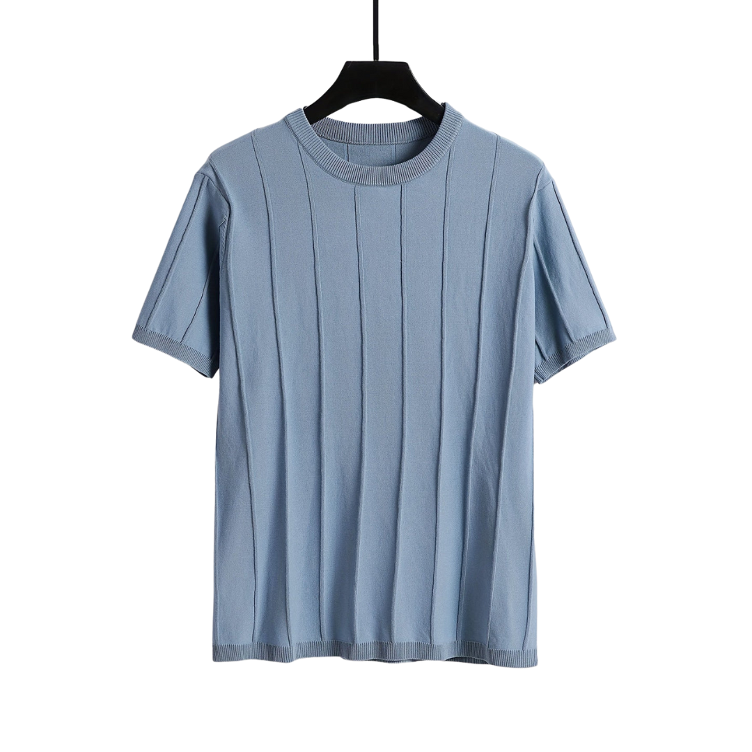 Dieses Oberteil hat ein strukturiertes Design mit vertikalen Linien. Es verfügt über einen einfachen Rundhalsausschnitt und kurze Ärmel. Das Design sorgt für ein strukturiertes Aussehen, was es zu einer markanten Ergänzung Ihrer Garderobe macht.