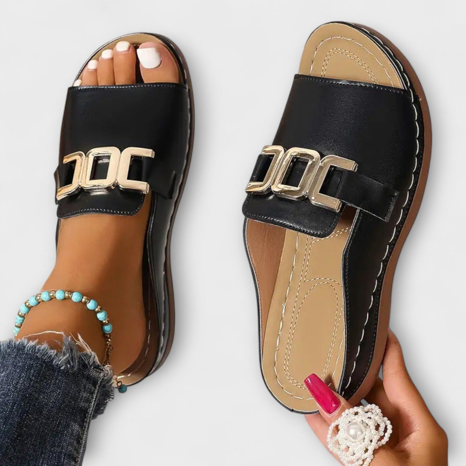 Tinsley – Riemchen-Slides – Heben Sie Ihren Alltagsstil mit einer perfekten Mischung aus moderner Einfachheit und raffinierten Details hervor. Diese Slides verfügen über eine auffällige Schnalle und ein unterstützendes Fußbett, was sie ideal für den Übergang von lässigen Besorgungen zu schickeren Mittagessen macht.