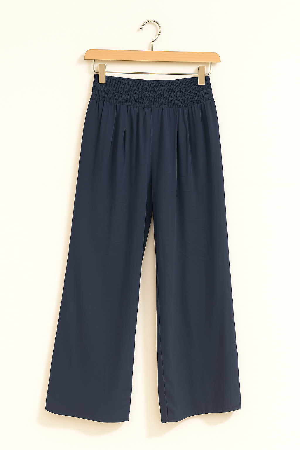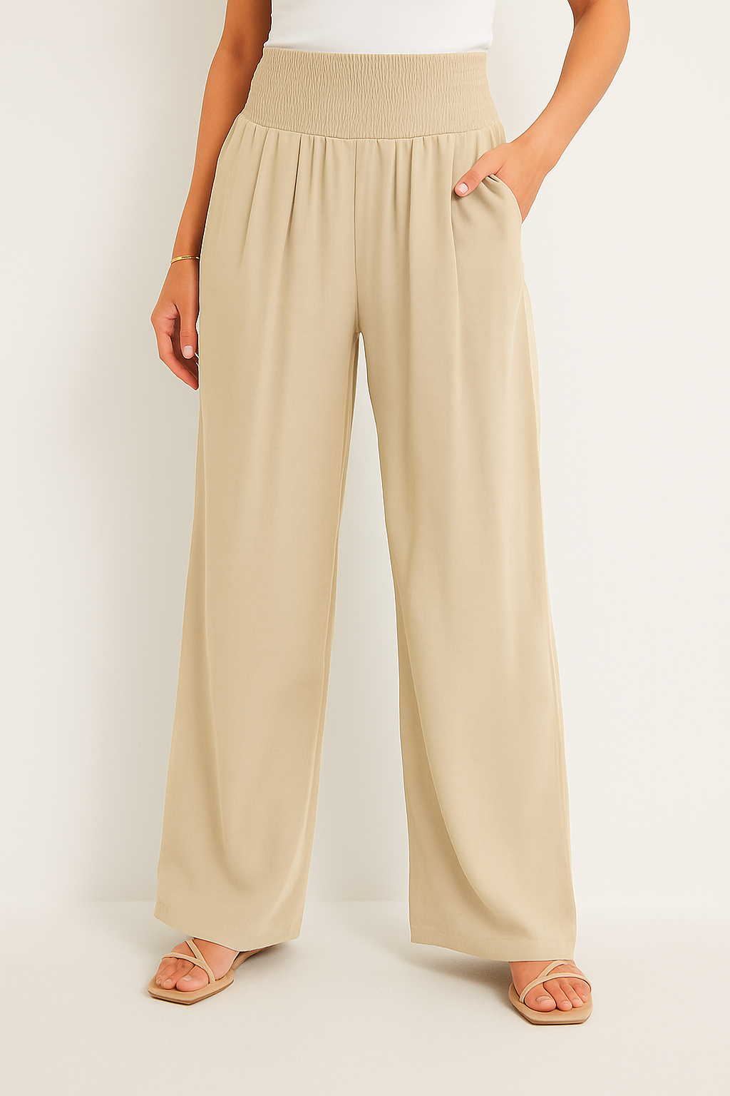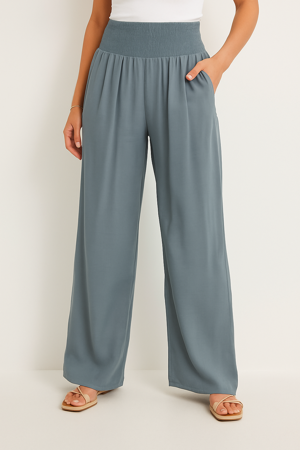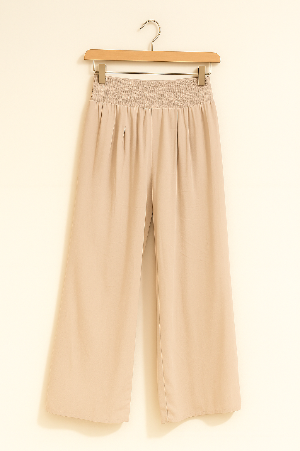 Diese luftige Hose ist wie gemacht für warme Tage, an denen Komfort und Stil gleichermaßen zählen. Der elastische High Waist Bund sorgt für eine flexible Passform, während das weite Bein eine elegante, fließende Silhouette zaubert. Ob am Strand, beim Stadtbummel oder im Urlaub, dieses Modell lässt sich mühelos kombinieren und begleitet dich durch jeden sommerlichen Anlass.
