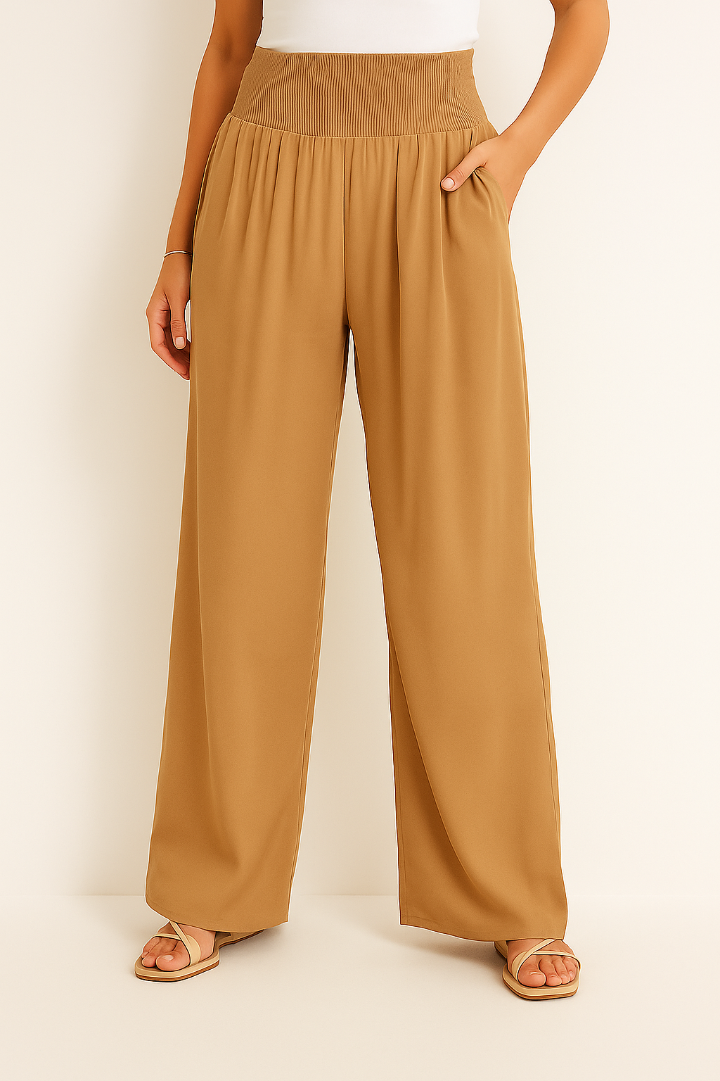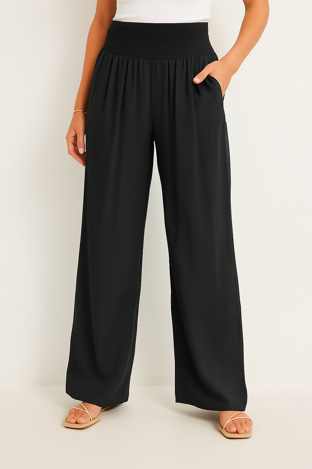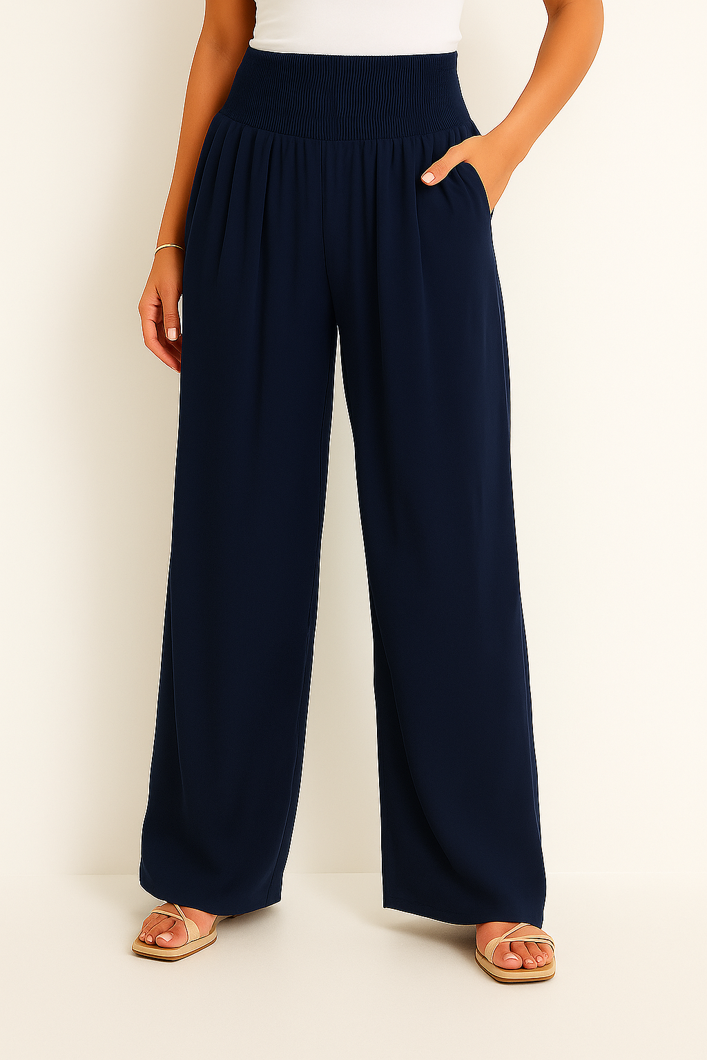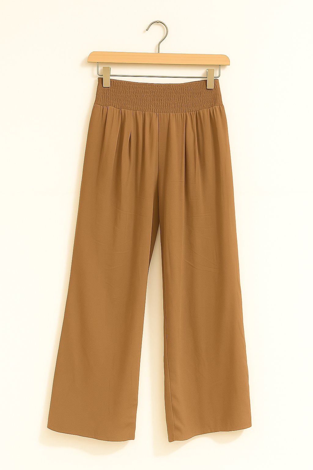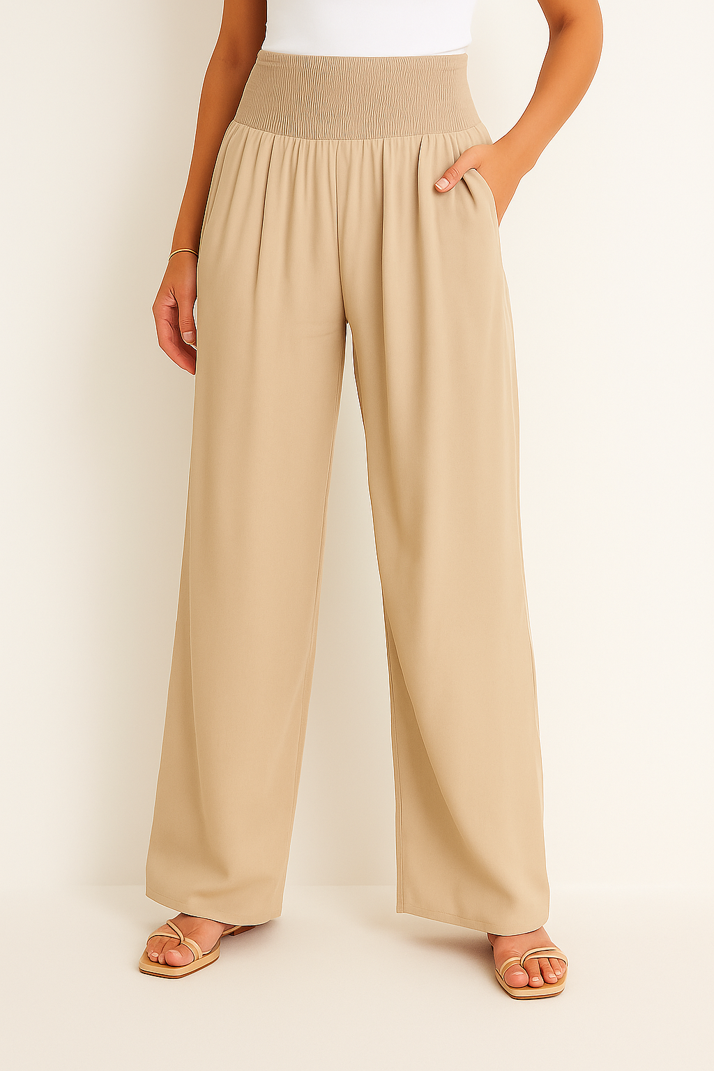 Diese luftige Hose ist wie gemacht für warme Tage, an denen Komfort und Stil gleichermaßen zählen. Der elastische High Waist Bund sorgt für eine flexible Passform, während das weite Bein eine elegante, fließende Silhouette zaubert. Ob am Strand, beim Stadtbummel oder im Urlaub, dieses Modell lässt sich mühelos kombinieren und begleitet dich durch jeden sommerlichen Anlass.